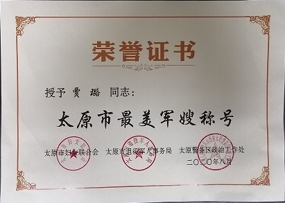 近日,太原市政集團安裝公司辦公室主任賈璐被太原市婦女聯(lián)合會、太原市退役軍人事務(wù)所、太原警備區(qū)政治工作處評為“太原市最美軍嫂”。