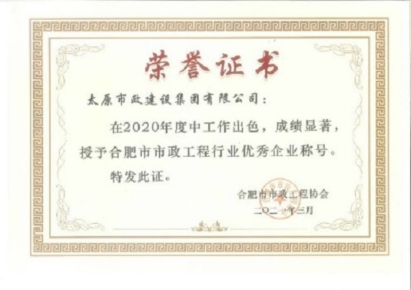 3月,集團(tuán)公司榮獲合肥市市政工程協(xié)會(huì)頒發(fā)的2020年度“合肥市市政工程行業(yè)優(yōu)秀企業(yè)”榮譽(yù)稱號(hào)。張晉虎、王東根榮獲2020年度“合肥市市政工程行業(yè)優(yōu)秀項(xiàng)目經(jīng)理”榮譽(yù)稱號(hào)。